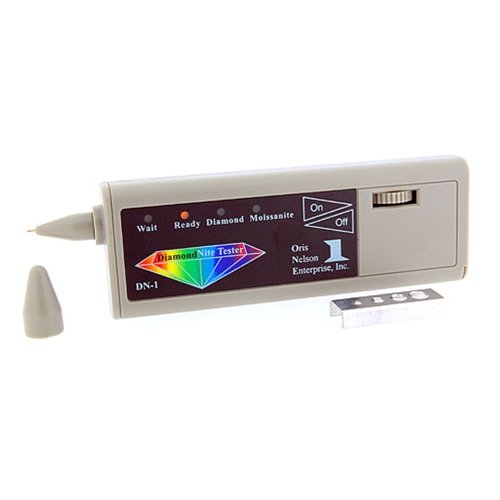DiamondNite is the first and only one step dual tester for non-diamond such as cubic zirconia, artificial moissanite, or genuine diamond. Just touch the probe to the stone - lights will show, if it's moissanite, other artificial diamond, or a genuine diamond; confirm it by beeps - no beep means it is a CZ or other fake, the first continuous beep means diamond (green light), or if it is followed More Detail